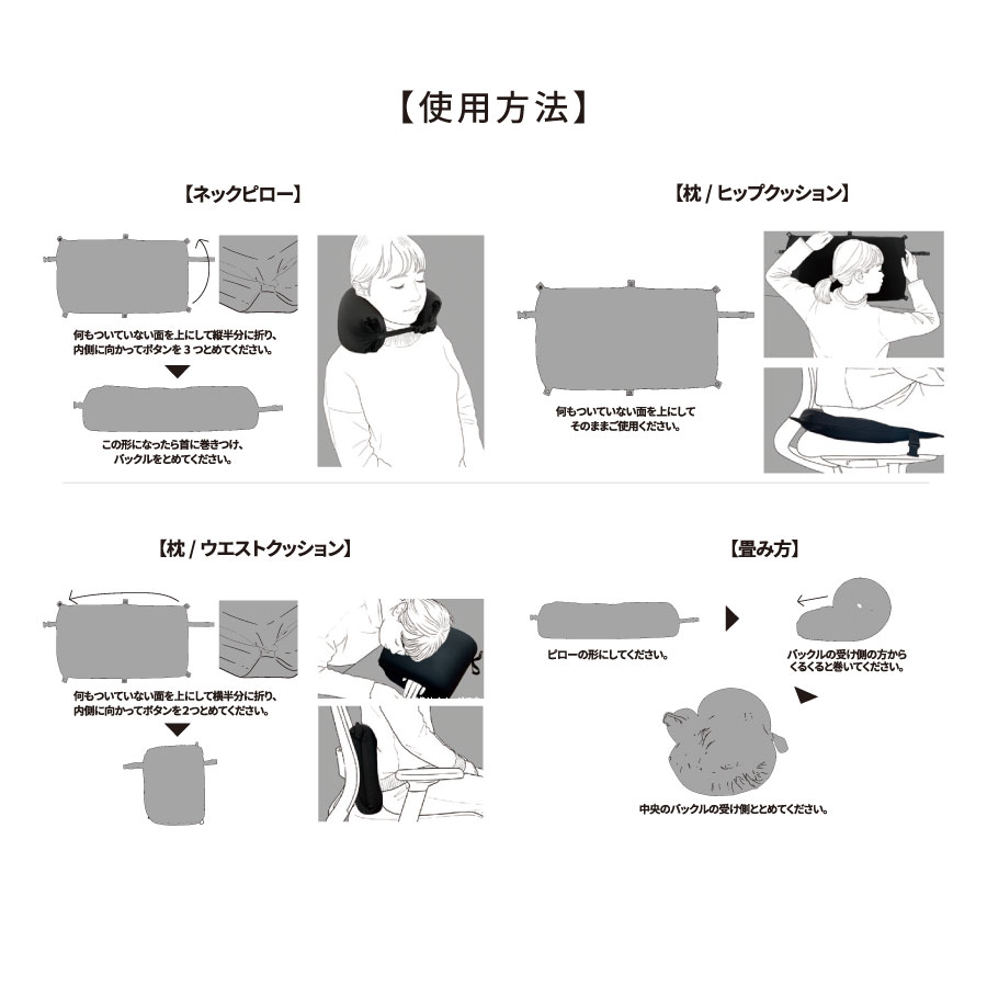ネックピロー、腰用クッション、おしりクッション、枕等と形を変えて様々な用途に使用できる低反発のマルチピローです。